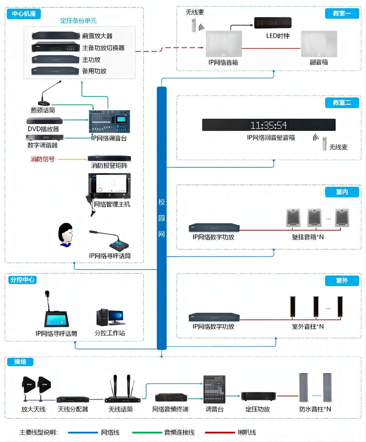 嚴格按照學校要求,結合學校的建筑結構及相關設計標準進行規(guī)范設計,融合“日常廣播、教學廣播、管理廣播、分控廣播、教室擴聲、操場擴聲、雙向對講、信息發(fā)布”等功能于一體的綜合性校園廣播系統(tǒng),集成了定時自動打鈴、教室多媒體擴聲、教學擴聲、雙向可視對講、多級分控管理、音頻實時采播等國際先進多媒體技術在教育教學中的最新應用。