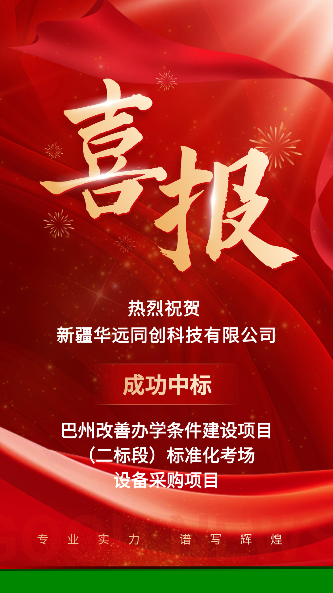 金秋時(shí)節(jié)收獲多,中標(biāo)喜訊乘“豐”來!近日,在全體員工的共同努力下,新疆華遠(yuǎn)同創(chuàng)科技有限公司成功中標(biāo)巴州改善辦學(xué)條件建設(shè)項(xiàng)目(二標(biāo)段)標(biāo)準(zhǔn)化考場設(shè)備采購項(xiàng)目。