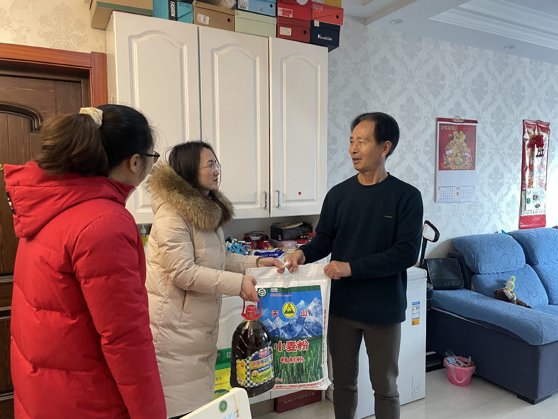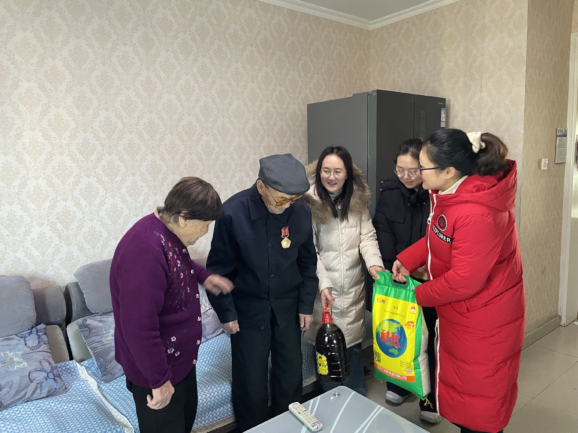 慰問現(xiàn)場(chǎng),楊長??偨?jīng)理親自帶隊(duì),和社區(qū)工作人員將慰問品送到警務(wù)站一線民警手中,對(duì)他們長期扎根一線,保護(hù)人民群眾生命財(cái)產(chǎn)安全表達(dá)了誠摯的感謝。隨后,社區(qū)人員和公司代表一同將米面油等慰問物資,分別送到5位退伍軍人家里,并與他們交流生活近況,叮囑他們保重身體。