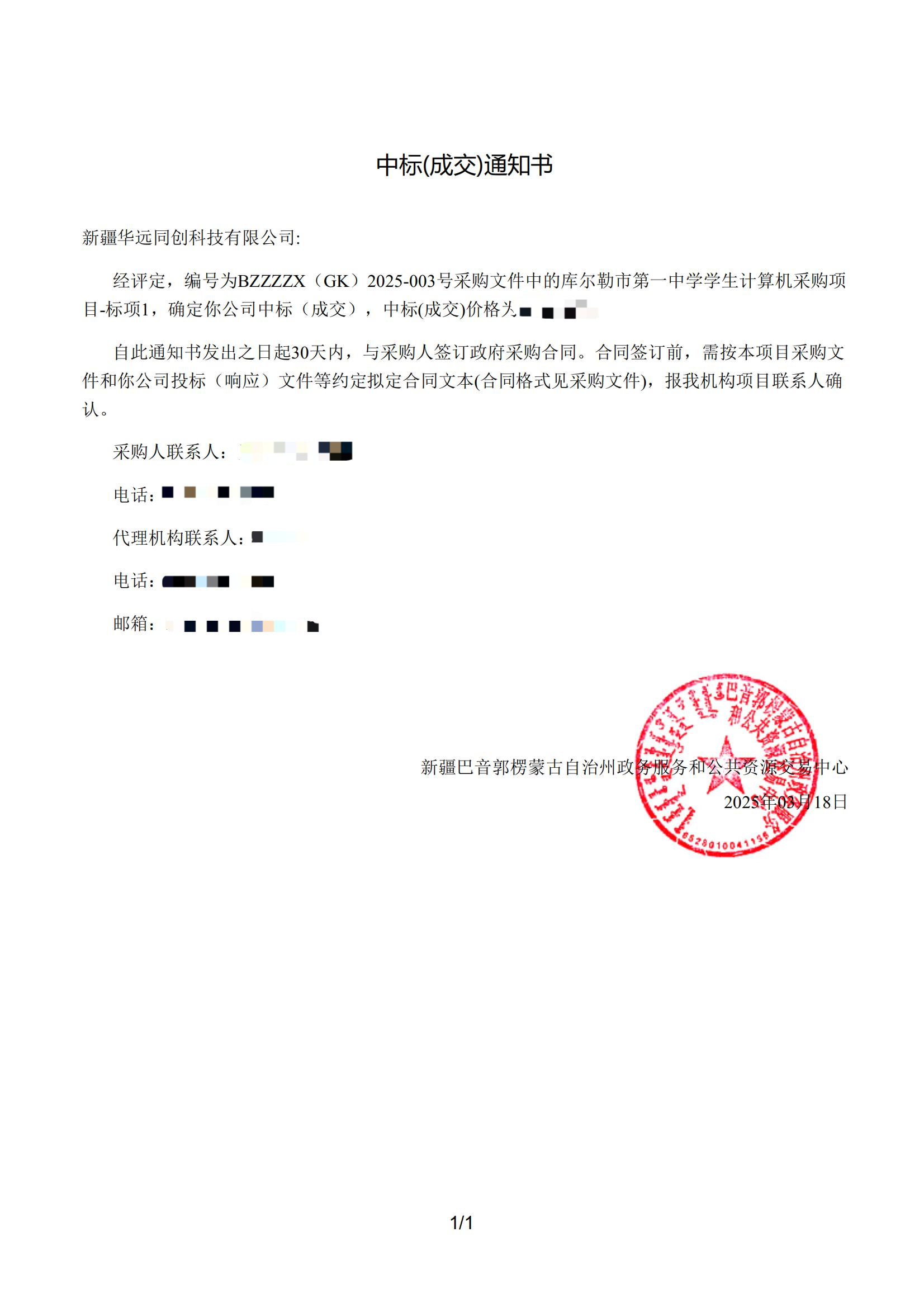 2025年3月18日,新疆政府采購網(wǎng)發(fā)布中標(biāo)公告,新疆華遠(yuǎn)同創(chuàng)科技有限公司憑借卓越的技術(shù)實(shí)力與優(yōu)質(zhì)的服務(wù)方案,成功中標(biāo)庫爾勒市第一中學(xué)學(xué)生計(jì)算機(jī)采購項(xiàng)目,打響開年第一標(biāo)!