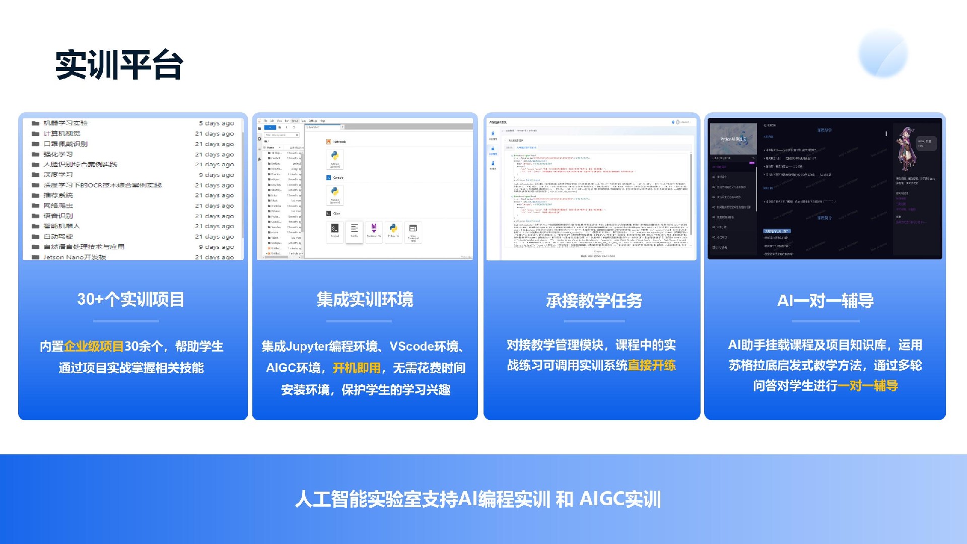 培訓(xùn)會(huì)上,專家老師深度講解北大青鳥人工智能平臺(tái)的核心技術(shù)、基礎(chǔ)設(shè)置及教育應(yīng)用場(chǎng)景。該平臺(tái)依托DeepSeek,集成主流編程環(huán)境、編程語(yǔ)言及人工智能框架,采用私有化部署,能夠針對(duì)不同學(xué)校(k12、中高職、專科、本科等各個(gè)教育層次)的個(gè)性化需求,提供定制化服務(wù)。人工智能平臺(tái)功能豐富多樣,具有深厚的課程資源和AI技術(shù)積累,包括AI實(shí)訓(xùn)平臺(tái)、教學(xué)平臺(tái)、教研服務(wù)、科研創(chuàng)新平臺(tái)以及教學(xué)資源庫(kù)等,能夠?yàn)閹熒峁┲悄芑虒W(xué)輔助和學(xué)習(xí)支持,助力教育質(zhì)量與效率的雙提升。