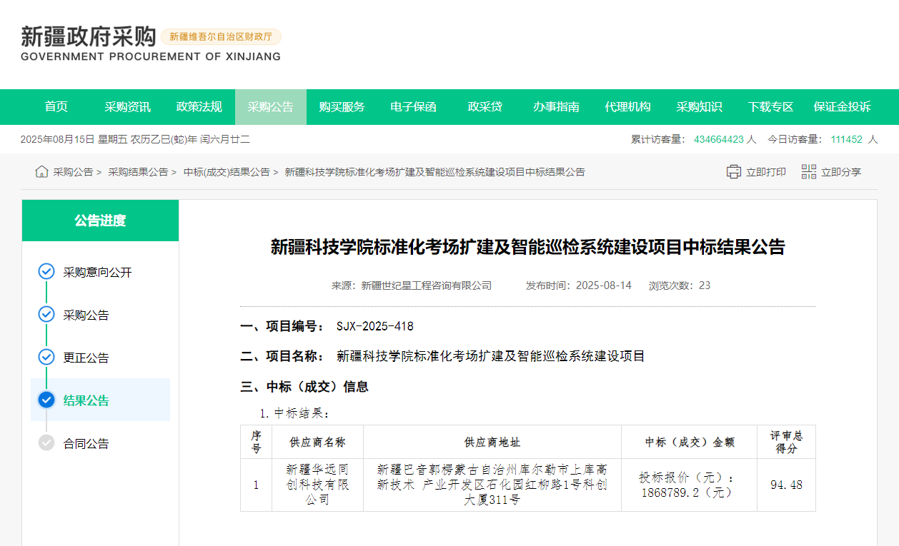 2025年8月14日,新疆政府采購(gòu)網(wǎng)發(fā)布中標(biāo)公告,新疆華遠(yuǎn)同創(chuàng)科技有限公司憑借雄厚的綜合實(shí)力,以94.48分的佳績(jī)成功中標(biāo)新疆科技學(xué)院標(biāo)準(zhǔn)化考場(chǎng)擴(kuò)建及智能巡檢系統(tǒng)建設(shè)項(xiàng)目,在教育信息化領(lǐng)域再添里程碑項(xiàng)目。