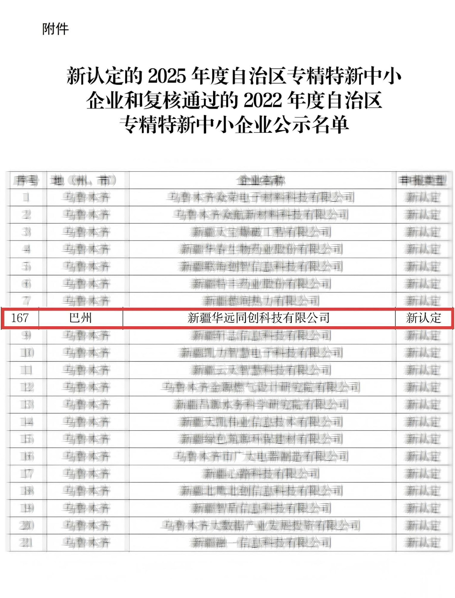 近日,新疆維吾爾自治區(qū)工業(yè)和信息化廳正式公布了2025年度自治區(qū)專精特新中小企業(yè)新認(rèn)定名單。新疆華遠(yuǎn)同創(chuàng)科技有限公司憑借專業(yè)的技術(shù)實(shí)力、精細(xì)的服務(wù)態(tài)度和創(chuàng)新的發(fā)展理念,成功通過“2025年度自治區(qū)專精特新中小企業(yè)”資質(zhì)認(rèn)定。